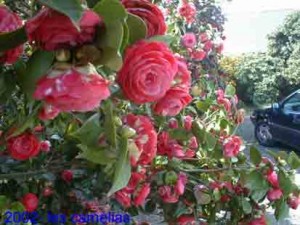Le jardin possède plusieurs camélias dont les plus anciens ont été plantés vers 1950. Dans la cour, les 4 plus grands égaient en février, mars et avril: rose, rouge au coeur jaune, blanc à coeur jaune. Je ne connais pas les variétés, mais c’est un enchantement au printemps.